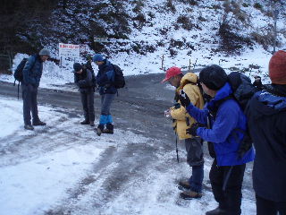 | 今年もよろしくお願いしま〜す♪ 西武秩父駅で親方さんとも合流です。今回女将さんともやっとご対面、そしてご挨拶(^^♪ イメージ以上に明るい方でサイテイもますます楽しくなりました。 このあと3台のタクシーに乗り合わせて出発しますが、9日に降った雪で登山口まで行けないと、手前で降ろされてしまいました。 |