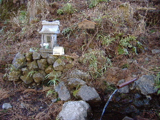 水場の元を見上げれば不動滝。 チョロチョロと流れています。 |
