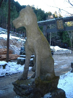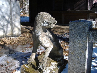 | 野生的な狛犬さん。ホネホネ、ガリガリ、宝登山と同じ狼・・山犬なのだそうです。余分なものを無駄につけていないで精悍な感じです。背中が苔むして時代を感じます。 | ||||