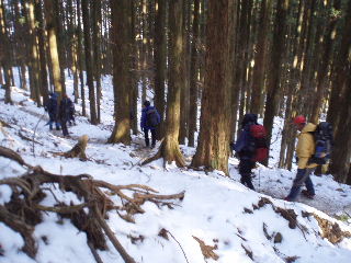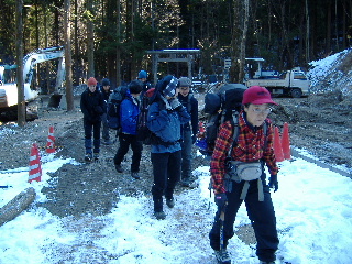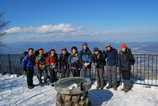 | H21年1月17日(土) 天気;晴 Member.9人(かいねこさん、親方さん&女将さん、heppocoさん&heppoco隊長さん、まゆ太さん&¥さん、トシちゃん&sanae) 【コ ー ス】(〜は歩、休憩時間含む) 西武秩父駅=(タクシー)=生川コースの林道途中まで9:38〜一の鳥居前10:02〜武甲山山頂12:30-14:18〜生川コースの林道途中16:50=(タクシー)=武甲温泉(入浴&新年会) |