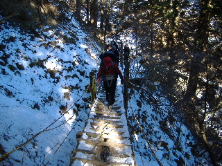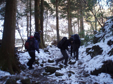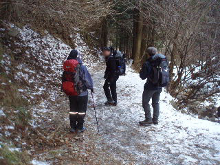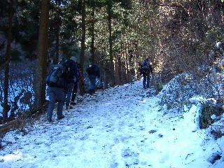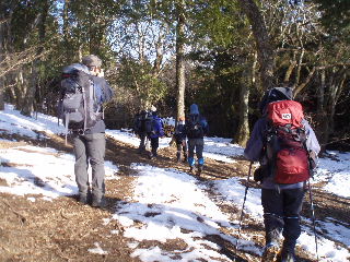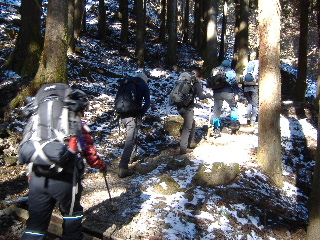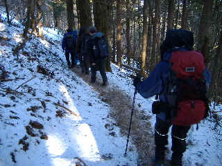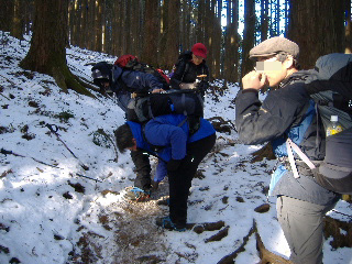 | かなり長いこと休憩しまして、委員長をヤキモキさせながらやっと下山です。 同ルートを下ります。早々にアイゼンをつけているメンバーを見て、我らも装着。 |