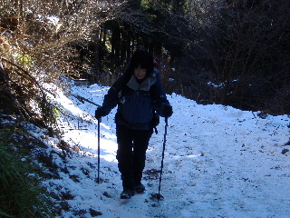 | それぞれにカメラタイムでゆるゆる進みます。sanaeさん、ツルツルの積雪が気になって顔が引きつってます^_^; 苦手なんです。 | ||||