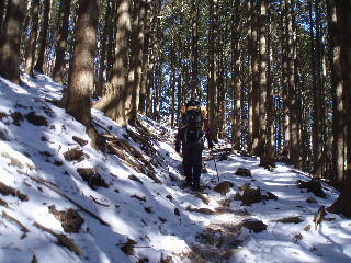| ずっと杉林の中。 武甲山といえばチチブセメント!今も採掘は続いていますから、西武鉄道の方から見ると緑の山という感じがしませんが、杉の植林といえどもこちらはごく普通の山の中。 ゆっくりペースで助かります^_^; |