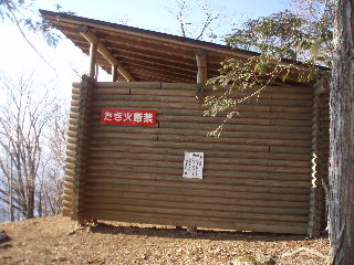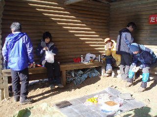 | 振り返れば富士山も見えるようですが、落葉した木々の向こうは生憎の霞み。見えず残念でした。 寒くもなく穏かなお天気でのんびり展望を楽しみますが、お昼休憩は先ほどの休憩舎に戻ります。 |