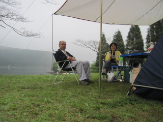 ファミリーキャンプも数グループいましたが私達は外れにテントを張ったため、周りは静かでとても落ち着きました。夜のしじまに浮かぶ山並みと湖・・・と言いたいところですが、早くも霧雨で辺りは靄に包まれ、遠くの灯りがいくつかボワ〜ッと揺れてました。ん?酔ったか?(笑; いえいえ、せいぜい一缶(たくさん持って行ったのに^_^;)・・・・でもやはりこれで十分な我らです(弱っ!^_^;)。