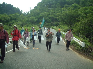 富士見山荘までの林道は車が通るせいか、吸い殻や紙くず、空き缶など投げ捨てられていた。ペットボトルやカップラーメンなど、大きなビニール袋に入れられたまま、置かれているものもあった。今回使用の収集袋ではないし、スタートは私達が早い方だったので前のグループが収集というのは先ず無い。とりあえず代表大澤さんの指示により、無線でヤビツ本部に連絡を入れる。
