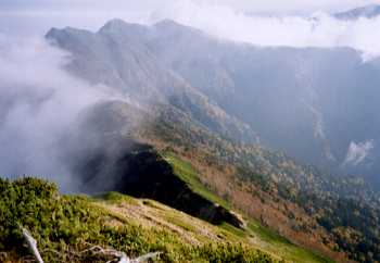 H13年10月6日〜8日(土日月)前夜発天気;1日目晴れ、2日目快晴、3日目晴 Member.2人(夫婦) 【コ ー ス 】 (〜は歩、休憩時間含む) 一日目(6日) 【五竜岳より鹿島槍ヶ岳を望む】右 遠見尾根から五竜岳には今回2回目となる。前回の五竜岳は1998.7/18-20だった。その先は初めてだが、すこしでもルート経験があるというのはいくらか安心感を伴う。幸い、三日間好天に恵まれ、予定通りのコースを進むことが出来た。しかし、テント泊での縦走装備は思ったより負担だった。水は小屋で調達すべきだったかもしれない。小屋泊まりならもっと楽に行けただろう(でも小屋泊まりは二人分で、日程的に重なると経済的負担が馬鹿にならないし・・・)。一番のこだわりは、万が一の装備なのである。余儀なくビバークをせざるを得ないときの備えということだ。・・・出発日に健康診断があったのだが、それはハンデとなったかどうか・・・(バリウム飲んだのは辛かった・・・・ボソリ) ただし、今回のコースは指定場所以外のキャンプは禁止されている。時期的に、既に閉鎖されている山小屋もある。今回のコースに限ってはキレット小屋が9/30日で閉鎖されている。他の小屋も期間営業なので、今後行かれる場合は必ず確認された方がよい。 紅葉の一番きれいだったのは種池山荘から下った所だった。いつもなら、この時期扇沢あたりも紅葉できれいなのだそうだが(タクシーの運転手さんの話)、例年より少し遅れているそうだ。 【前夜発:5日(金)】 中央道の工事渋滞が2回あったが、どちらも15分程度で通過。あとは比較的順調だった。豊科ICを下りて、大町方面へと進み、R148から遠見尾根登山口へ向かう時、工事中で迂回路がとられていた。 五竜とおみスキー場の駐車場に0時半着。レストハウスは鍵がかかっているのでトイレには入れない。予め済ませてから行った方が良い。テレキャビン乗り場のトイレは確認していないので不明だが、朝は入れる。洋式トイレで、ペーパーつき、洗面台もあり、きれいだった。さすがスキー場。 【一日目:6日(土)】 予定より少し早く、6時半起床。快晴で、この時は山がくっきりときれいに見えた。支度をして早々にテレキャビンの乗り場へ。既にザックが並んでいた。夏は7時から営業だが、今の時期は8時半からになる。料金は片道840円(大人)。荷物料金は10キロ100円、20キロ200円となっている。2泊だからちょっと贅沢な食材にして、保険に6爪アイゼンも持ってきたり、水を持ったりで、私たちは20キロ200円追加。側に一応秤がおいてあるが、これは自己申告のようだ。 この乗り場で待つ間、記憶に残っている女性と出会った。間もなく昨年2月に酉谷山の小屋で一緒だった人だと思い出した。前回同様単独だった。今回はどうやら同じコースということで、途中何回か話ながらの山行となった。こんなこともあるのだと驚いたが、私の名前を憶えていたのにはもっと驚かされた。 少し早めに稼動したので、アルプス平駅に8:30着。そこからは二人乗りリフトも動いていたが、乗り場まで少し下るし、歩いてもたいした距離ではないのでそのまま歩くことにした。殆どの人はリフトを利用していた。私は重い荷物をリフト上で支えるのも辛いだろうと思ったのだが、後になって夫が「やっぱり、乗りたかった」という。今更もう、知らん。朝の快晴とは変わって、ガスが少し出てきた。 歩いていると、前回のことを思い出す。あの日は偶然にも広沢氏とニアミスだったことが後から分かったのだが、その広沢氏はその後冬山で遭難死され、今はもういない。 花はリンドウが少し咲いているくらいだが、紅葉は素晴らしかった。多少鮮やかさに欠けるかなとも思ったが、時期的にまだ早いものか、遅いものか分からない。 小遠見山は360度の展望で、鹿島槍ヶ岳の眺望が良いというので楽しみにしていたのだが、またしても望めなかったのは残念だった。大遠見もまた同様だったが、好天としても展望は小遠見の方が良いようだ。 西遠見あたりでまず夫のペースが落ちてきた。休もうとしたが、時間がまだ早いから先に進むという。途中、水1リットル分を私の方に移した。小さなアップダウンがあって、鎖場も現れてくる。鎖に頼らずに登ろうと思えば登れるような場所ではある。そのためか、この鎖場の記憶が残っていない。しかし、今回は私自身もペースが落ち、鎖を頼ってよじ登る。前回はこの辺りで雷鳥を見たのだが、今回は初めてオコジョを見た。まだ茶色いのでまるでリスのようだ。 すっとガスの切れ目に五竜山荘と五竜岳が見えてくると、登りも更にきつくなる。後もう少しだと思ってからが長かった。ガスが切れて日があたると暑かったが、尾根に近づくほどに風が冷たくなった。ペースがますます落ちて、休みながら登っていった。 山荘に着いたのは14時頃。コースタイムよりいくらか早かったのは意外だった。 私たちはテント泊(一人500円)だが、山荘は、1畳あたり2〜3人と入口に書いてあった。建物は
