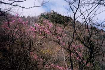 アカヤシオが満開で素晴らしかった。H13年5月3日(木) 天気;曇り時々晴れ Member.2人 【コ ー ス 】 湯ノ山温泉(蔵之助旅館)7:45〜中道登山口8:10〜(休憩8:55-9:10)〜御在所岳9:05-?〜(昼食)〜武平峠12:05〜鎌ヶ岳12:53-13:15〜(長石谷)〜登山口14:55〜湯の山温泉(蔵之助旅館)15:05 【御在所岳、アカヤシオ】右 GWは八ヶ岳縦走の予定を立ててはいたのですが、今回は残雪の山を縦走装備で歩くのは体力的に無理があると思い、直前になって、すべて日帰りの出来る鈴鹿、伊吹方面に変更。御在所〜鎌ヶ岳(3日)、藤原岳(4日)、霊仙山(5日)そして伊吹山(6日)を歩いてきました。 四日間続いてのピークハントも又結構ハードでしたが、新緑とお花いっぱいの山々を楽しみ、毎日温泉orお風呂に入れる優雅な山行でした。 初日は御在所〜鎌ヶ岳。直前での変更だったため地図が手に入らず、とりあえずHP情報を収集して自宅を2日の午後2時半に出発。途中休憩や夕食などしながら湯の山温泉に21:30に到着。蔵之助旅館の駐車場に置かせてもらった(600円)。そばに水洗トイレもあり便利。地元でも地図が調達できなかったため、近辺のガイド図頼りだったが、この場所に車を置いたのは正解だった。 来るとき、途中から降り出した雨は翌朝5時も降っていた。様子をもう少し見ようとウトウトし、6時半に起きると雨は止んで明るくなっていた。思ったより早い回復に喜んで支度を始め、7時45分に出発。登山口まで林道を少し歩くことになるが(25分ほど)、途中、鎌ヶ岳の登山口をチェック出来たおかげで、御在所だけの予定を変更し、鎌ヶ岳を回るコースにした。これがまた素晴らしいコースだった。 HPによると中道コースがよいとあったのでこのコースをとった。林道突き当たりの車道(鈴鹿スカイライン)を横切って道路沿いに左へ登っていくと、まもなく中道登山口に着く。登山計画書をポストに入れ、登山道を歩き出す。花崗岩の登山道は水はけがよいのか昨夜の雨も気にならずに登れる。でも下りは滑りそうだ。足下のショウジョウバカマ、各種のスミレ、イワカガミ、など、まだわずかに残っていた。タテヤマリンドウもポツポツと咲いていた。アカヤシオが咲き、辛夷もほんの少し残っていた。はじめはガスがかかっていたが時折切れて、眼下に伊勢湾が見えてきた。快晴ならば絶景だろう。オバレ(負れ)岩も展望がよいそうだが今回は残念だった。しかし倒れかかったような大きなオバレ岩に、何本も木ぎれを支えのように立てかけてあるのを見たときはつい笑ってしまった。おまじないなのか分からないが、気休めでも、そうしたい心理が人間にはあるものなのだなぁ・・と。 休憩しながら展望のよいところで休んでいると、夫の「おおーっ」という声。振り向くと、今まで見えなかった山頂方面のガスも晴れ、姿を現した。なんと見事にアカヤシオで彩られている。とってもきれいだ。蕾の木もまだたくさんあったので、しばらくは楽しめるだろう。 山頂の端にたどり着いて、そこから山頂ロープウェイ駅に向かうと、観光地らしく、ヒール姿の女性を伴ったカップルや、軽装の人たちと出会うようになった。山頂駅の側でビールを買い350mlを二人で飲む。といっても殆ど私が飲んでしまったが、美味しかった。350mlは350円、500mlは500円、ということは1ml=1円ということ。 日帰り登山の格好でさえ、奇異に感じる山頂での観光客とのアンバランスの中、鎌ヶ岳への稜線に目をやるが、とぎれとぎれの風景ですっきり見えなかった。