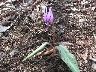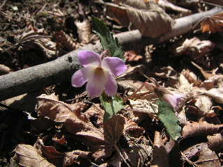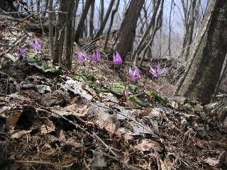 しばらくは下草もほとんどなく、もくもくと登っていく。2回目の夫が「こんなに急だったっけ・・忘れちゃうもんだな」と笑ってる。私もこれで5回目くらいだが、急登は憶えていても苦しかったことは忘れている。普通嫌なことや苦しいことは繰り返せば警戒することを学習するものだが登山はどうしてこうも馬鹿になれるものか。 サス沢山で小休止し、奥多摩湖を眺めてから再び歩き出す。そのうち夫が踵の靴擦れを気にしだした。カタクリが現れてきたのもそのころだった。 広いところで休憩し、夫は靴擦れのケアをし、私は周辺でカタクリやスミレにカメラを向ける。 |