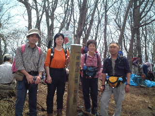 この日はイヨカンと、八ヶ岳で食べ損ねたカレーライスを食べ、ゆっくりとコーヒータイム。 夫の足の具合で同ルートを戻ろうかという話しも出ていたが、テーピングでいくらか落ち着いたらしい。鋸尾根へまわるという。片付けた後山頂へ。 山頂への登山道は古い杭を新しく変える工事をしている最中だった。作業はお休みだったが、山頂にも丸太の杭が山積みしてあり、新しい木の匂いがプンプンしていた。山の上まで持ち上げて、大変な作業だと思う。 狭い山頂はその上人で溢れていた。今回も都岳連の旗が立ち、環境を守るため簡易トイレと、カタクリの成長過程のパネルを展示していた。花が開くようになるまでに7年かかるというカタクリ、いつまでもこの山に咲いていてほしいものだ。 |
