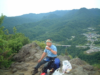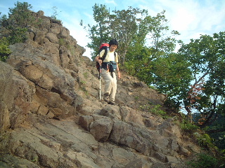 | 2003年8月北海道の山旅 (8日:利尻山、9日:礼文岳、11日:斜里岳、12-13日:羅臼岳、14日:雌阿寒岳ー阿寒冨士、 15日:摩周岳、16日:雄阿寒岳、17日:白雲山ー天望山、18日:八剣山) 天気;晴 Member.2人(夫婦) 【八剣山:中央登山口より】右 駐車(路上)5:00〜中央登山口5:10〜八剣山山頂6:00-30〜西登山口7:00〜駐車(路上)7:12 長旅だったので後半は観光気分の気楽な山行を心がけていた(夫のために^-^;)。札幌近辺の山では小樽の余市岳がお薦めと聞いていたので是非登りたかったのだが、日程的に最終日となってしまい、短時間で登れる八剣山にした。 宿の朝食に間に合うよう早朝登り、温泉に入ってから小樽で買い物。そのあと新千歳でレンタカーを返却して空港へと向かうことにした。これは最終日の行程としては無理がなかった上に、この山にしたことで満足感があった。 八剣山は宿泊先の定山渓、小金湯パークホテルから車で10分とかからない場所にあった。ゴジラの背のような山頂で、走っている車の中からもそれと分かる山容だった。500mにも満たない山ながら、ほぉーっと惹き付けられる。 近くの通り沿いに車を置いて、中央口から登ることにした。駐車場ありと書かれていたのだが、どこが駐車場でどれが私有地なのかよく分からなかった。のどかな農園に囲まれ、麓にはキャンプ場がある。お盆を過ぎて、人はあまりいないようだった。この中央口はキャンプ場で作ったものだろうか?登山者名簿もしっかり用意されており、記帳してから登っていった。いきなりの急登だ。ふくらはぎがキュキュキューンと伸びきってしまうような、山に登っているという心地よさ! 自然林に囲まれて、植層は豊かだ。もう少し時期が早かったら、ここもいろいろなお花が楽しめたのだろう。資料によれば、盗掘で花の数は減っているという。里山だけに被害は大きいのかもしれない。残念なことだ。 途中南登山口からの登山道と合流し、ここからさらに醍醐味のあるコースへと向かう。両脇の木々の間からは里の風景が望めるのだが、山そのものの形状の面白さは、登っていても小気味の良いちょっとしたスリル感が味わえる。麓から眺める山の裏手にしっかりした登山道があり、ロープなど用意されて、気をつけて歩けば危険は少ない。ボコボコした岩場の山上には踏み跡が残っており、強者がいるものだと思わず笑ってしまった。ザイルワークやアイゼン歩行のトレーニングにも使われているそうだから納得ではあるが、さすがにそこを歩く勇気は私にはない。想像するだけで足がすくむ。 山頂にはしっかり八剣山と書かれた標識があった。それほど広くはないが、早朝二人だけなので、ゆっくりできた。朝日が気持ちよかった。今回初めて見る朝日だ。そういえば朝も夜も霧が多く、星空を全く見ていない。足を踏み外せば切れ落ちた山の下へ真っ逆さまだ。危険でない場所に座りつつも、夫は体全体で退いているのがその表情から伺え、おかしい(自分を棚の上に置いて^-^v)。穏やかで爽やかな中、早朝のモーニングコーヒーを飲みながら最後の山行を堪能。 下りは西口へ。こちらも急で、ストックがなかったら大変そうだ。ロープも所々に設置されているが、雨が降った後などは滑って大変だろう。ようやくなだらかになったと思ったら、今度は熊笹に、体全体が覆い隠されるような登山道になった。西口はあまり利用されていないものか?