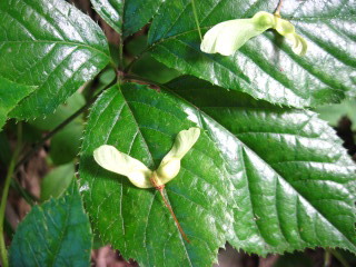 カエデの種。竹トンボのように飛んで、落ちた葉の上で一休み。 |