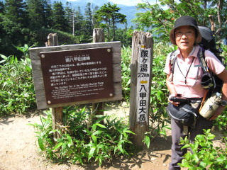 | H23年8月8日(月) 天気;晴。 Member.2人(トシちゃん&sanae) 【コ ー ス】(〜は歩、休憩時間含む。) 酸ヶ湯温泉登山口7:50〜仙人岱9:33〜八甲田大岳山頂10:33-11:33〜分岐(避難小屋)11:51〜上毛無岱〜下毛無岱〜酸ヶ湯温泉登山口下山13:31 (所要時間約5時間40分・・休憩含む) |