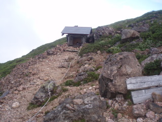 | 避難小屋。中をのぞいてみましたが土足厳禁できれいに使われていました。土足厳禁なので眺めただけですが、中にトイレもあります。 | ![]() |