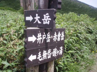 井戸岳分岐。井戸岳から赤倉岳を回って歩いてみたいものですが、今回も下山後五所川原の立倭武多を見に行くので避難小屋からそのまま下山します。 |