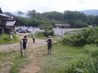 前夜青森のねぶたまつりと花火大会を見終わった後、酸ヶ湯温泉に移動。駐車場側にはきれいなトイレがあります。 朝起きると酸ヶ湯温泉の奥には八甲田大岳が見えてました。 簡単な朝食をすませ、8時前にスタート。トイレの脇の階段から登っていきます。 標高900mくらい、気温は25℃でした。 |