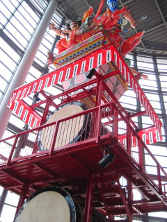 中に入ると天井が高く、 見上げる高さの忠孝太鼓とねぷたの台座がありました。 ![]() これは展示品かと思ったら実際に使われるものでした。 この周辺にはお土産品売り場があって 観光客でごった返していたのですが 直前にはすっかり片付けられました。 この台も、そして他の立倭武多も奥から出ていきます。 それは見事な手際良さでした。 |