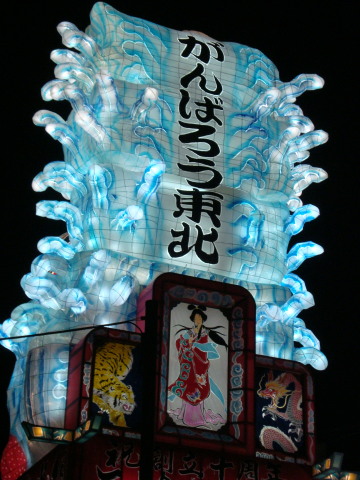 東北の祭りは今回この五所川原が最後でした。どこにいっても「がんばろう東北」の文字が書かれ、みんなで東北を盛りたてようと頑張っている姿を見てきました。東北の復興、繁栄を心より願っています。 |