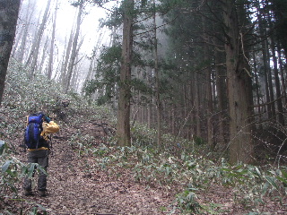 杉と熊笹?の中に階段が続く。やはりここも春先は杉花粉が沢山飛ぶのだろうか? |