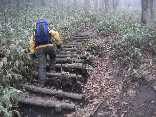 朝はガスっていた。天気はよい筈だが変わったのだろうか?登山者は少ない山なのかな?いや確か人気の山だったと思うよ〜なんて話しながら登る準備。 |
