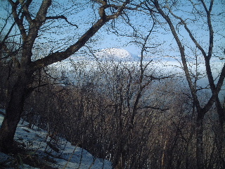 樹林の間に岩手山が垣間見え、やはり嬉しくて二人で歓声をあげる。落葉の時期なればこその景観だ。 |