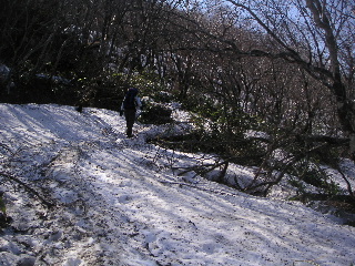 八合目で休憩し、再び歩き出す。雪の無い普通の登山道が続くが、一部雪道が残っていた。 |