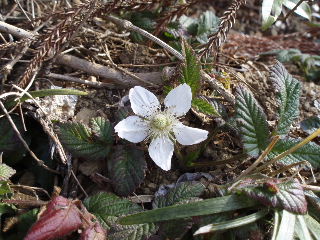 | ようやく咲いていた花。シロバナノヘビイチゴ?時期的にはまだ早いようですが・・・ | |