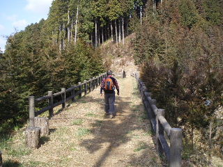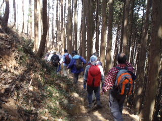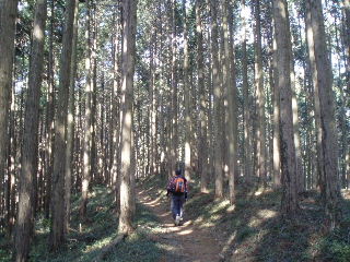 | ずっと杉林が続きます。良いお天気なので気持ちよい陽が差し込んできます。でも花粉症の人は辛いかも・・・って私も花粉症ですが、なぜかここ数年だんだん症状が軽くなっています。 展望は遮られますが、登山道は整備されハイキングには最適ですね。 |