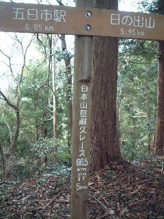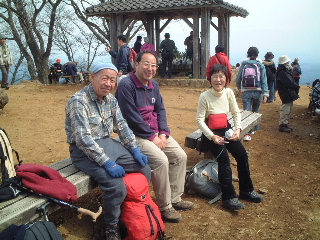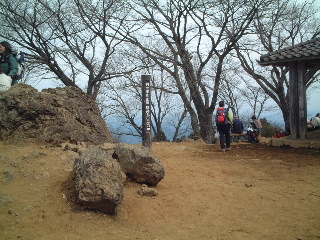 | 日ノ出山山頂。 標識の周りはたまたま人が少ないですが、山頂は案の定いっぱいの人でした。 もしかしたら知っている人に遇うかも・・・とは思いましたが、まさか彼らに会うとは思いませんでした。もうビックリ栗饅頭! |