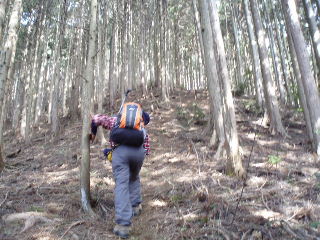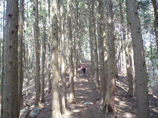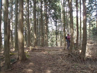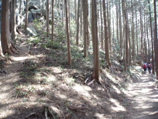 | やはり杉林。 上養沢からの道と合流するころ、初めて人と出会いました。日ノ出山から下りてきた人、上養沢から登ってきた人、それぞれ単独の男性でした。 なんとそれまでずっと誰にも出会わなかったのでした。 |