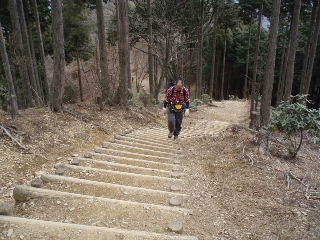 | 日ノ出山へ向かう道はきれいに整備された階段・・・ トシちゃんの溜息が洩れます。 |