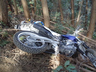 | 渋滞の原因はこの見物渋滞でしょうか!登山道脇にまさに今日転倒したのではと思われるバイクが・・・! トシちゃん、ビックバイクチャンスです、持ち上げていただいていきましょう♪って、冗談です。冗談はともかくハイカー数珠繋ぎ状態でした。 あたりにはガソリンの臭いが漂っていました。ナンバーも付いたままです。火がついたら大変!(翌日は雨、この心配は免れたでしょうか?) 持ち主は怪我したのではないか、そしてその後どうなったのかが気になります。 |
