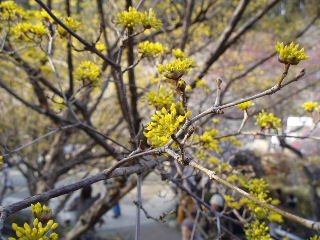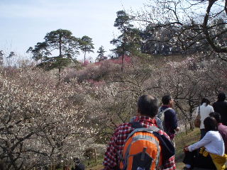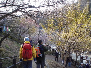 | まさに梅祭り、今日は丁度見ごろでたくさんの人でした。入園料は200円。 下の黄色い花はサンシュユの木。 |
