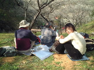 | クライミングだ!沢だ!アイスだ!雪山だ!って私より広範囲になんでも楽しんでいるこの人たち!かつて一緒に歩いた仲間でした(※注釈下記)。 「なんで此処にいるの?」って感じです(笑) 高尾山でしげぞうさんにバッタリして以来の衝撃でした(^^ゞ 「お花見だよ〜」って、似合わないっす!(爆) 「吉野梅郷で花見酒!・・・」あはっ!それで納得〜としばし思い出話に花を咲かせ、見ごろの花見の宴へと一緒に座を移動したのでした。 |
