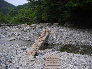 ゴーラ沢出合にかけられた橋はまた位置をずらしていた。昨年はある程度固定されていたが、荒天のたびに、流されたりしているのだろう。 そのまま通過して古いコンクリートの階段を登り、急斜面をよじ登る。はっきりとは目立たないが、登山道は常に整備されているのが分かる。 |