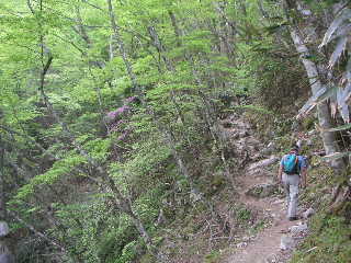 シロヤシオの花はまだ先だが、新緑がとてもきれいだ。しばらくは爽やかな新緑を眺めながらゆっくりと登っていく。 その新緑の中に、ちらほらミツバツツジが咲いている。檜洞丸といえばシロヤシオだが、このピンクのミツバツツジもまた存在感がある。 突然「おぉ・・・!」と言う夫の声。続いて私も「おぉ〜!」目の前にいきなり見事な満開のシロヤシオ。これだけ見られればもう充分・・・、心底そう思った。 そこから次々に素晴らしいシロヤシオが続く。蕾も多い。全体的に今年は花付きが良いように思えた。 |
