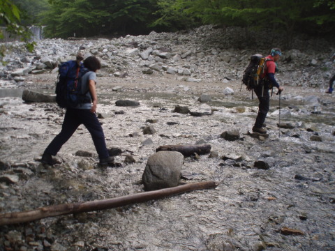 毎年様相が違いますが、この日は石伝いに渡れました。かつてはきれいな木橋が造られていたこともあったのですが、そのたびに流されているようで今回は影も形もありません。 |
