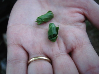 まもなく目についた“落とし文” オトシブミ、おしゃれな名前ですが中にはオトシブミ科の昆虫の卵が一個あるそうです。うろ覚えで中に虫が入っていて自ら葉を捲くとお友達に話してしまいましたが、間違えました。卵を植え付けた成虫が丁寧に外側から巻きつけて下に落とします。見事な包装、これからのお中元商戦に・・・なんて(^^ゞ 卵は中で孵って葉を食べて育つそうです。 |