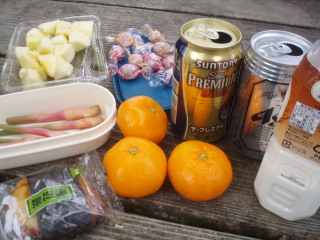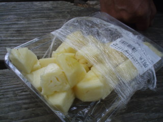 今回もパインをもってきました。来る途中のスーパーで一個をカットしてもらいましたが、甘くて美味しかったです。甘酸っぱい思い出の味といった感じでしょうか。一個198円だったのにカットしてくれてなんと150円!(@_@;) |