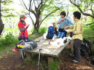 ここで先ほどのRさんに追いつきました。のんびり登ったと言いますが、やはり若いです。以前ミドリさん、のんちゃんと来た時もこのテーブルだったのでご一緒させていただきました(^^ゞ |