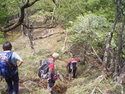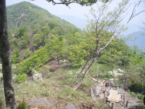 | 大笄(おおこうげ)、小笄(ここうげ)などのアップダウンを経て徐々に下っていきます。振り返るとこちらからは登りたくないと思いますが(まだ一度もこちらからは登っていません^_^;)、次々と登ってくる人とすれ違うのでした。80歳を過ぎていると思われる単独男性も登ってこられて驚きました。 | ![]() |