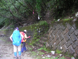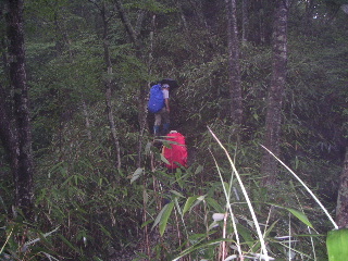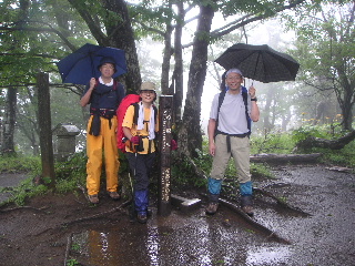 一人だったら不安だったかも知れないが、まきたさんも一緒だったので心強かった。稜線はおしゃべりしながら軽いアップダウンを行き、そろそろ急な下りになるだろうと思われるところで傘はたたんだ。滑りやすい登山道になるが、これだけ降ると、逆に足下がしっかり固まって歩きやすいように感じた。