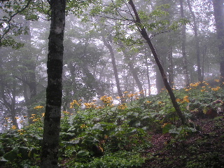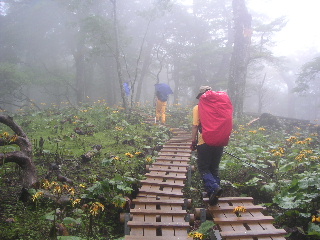 傘をさしての登りは時々不自由な所もあるが、のんびりと登っていった。シロヤシオの5月(今年)の時以来だが、山の斜面にマルバダケブキの黄色い花が広がり、小ぶりの可愛いシモツケソウやホタルブクロなど、まったく違った風景に私も感激。次のテーブルのある展望台で少し休憩してから整備された木梯子など辿って石棚山分岐に出ると、シロヤシオでも楽しめるそこはやはりマルバダケブキが一面に広がっていた。雨に弱いようで、降られるたびに腐ってしまうようだが充分楽しめた。