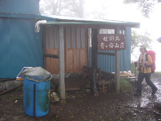山頂直下の木道周辺も見事だ。雨が醸し出す幻想的な風景もまた素晴らしい。木道を過ぎて、新しい人工物が目についた。以前にも何かあったが、また最近作られたものらしくソーラーと風力の設備(風力発電機併用ソーラーパネル四基)が設置されていた。植物調査の為か、神奈川県で設置したオゾン観測用電源設備らしい。必要なものかもしれないがちょっと興醒めだ。 山頂のブナ林は雨でひとしおはえている。苔むしたブナの大木に何故か宿り木のようにギボウシが咲いていた。黄色い小さな花まで咲いて、そこには今まで知らなかった世界が広がっているようだった。こんな日に登ってくる人は他になく、誰もいない静かな山頂をしばし堪能してから青ヶ岳山荘へと行った。この檜洞丸にはけっこう来ているが、青ヶ岳山荘へ寄るのは初めてだった。 思ったより立派な(失礼!)小屋で、トイレも新しいのが設置されていた。ようこそいらっしゃいと、温かく迎えてくれる感じの入口に向かって「ただいま」と言うつむぎさん、「お邪魔します」と入っていく水谷さん。そして私、まきたさんと続いて入っていった。中の明るい雰囲気にみな居心地良さを感じて思い思いに休んでいると小屋の人たちがやってきた。 乾杯して歓談していると外の雨がどんどん強くなってきた。台風は通常のコースとは異なる西へととっくに行っているはずなのに、丹沢にはまだ影響を残していた。1600mといえども山の気象はやはり分からない。つむぎさんからは「泊まっていったら?」と何回か誘惑され(笑)、その気にさせられそうに?なったが翌日の用事を控えてそうもいかず、雨の中まきたさんと下山した。 小屋から山頂を巻いてツツジ新道分岐へと戻り石棚山コースへと向かった。富士山はもちろん見えない。でもまきたさんが先に気付いて鹿の姿を遠くから見かけた。ユーシンへの分岐辺りもマルバダケブキの群生が見事だ。ブナやシロヤシオの樹林が雨でよりいっそう感動的。それをすっかり写真に映し出せないのが残念。でも登ってよかったと思えるひとときだ。