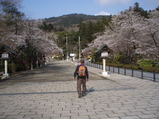 | 見事な桜並木、まだ7分咲きくらいです。 正面には宝登山。 この周辺にも、宝登山神社登山口にも駐車場はありますので、宝登山だけでしたらこちらに停めた方が近いです。前回は境内の駐車場に停めました。 朝早いため、参道はまだ静かですが、日中は混むのでしょう。 |