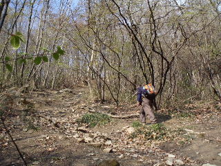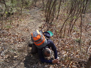 シュンランやスミレを眺めながらのんびり登りましたが視界が無く、踏み跡もやぶさかではなかったのでまた同じ場所に戻ります。 |
