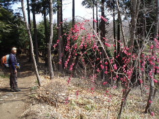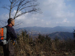 | 小高いピークは近くにありました。木の間越しに登ってきた宝登山も見えますので、そこで小休止です(左写真)。 すると反対側から夫婦連れ2組と小さい男の子を連れたパパさんが次々にやってきました。誰も通らない静かな山だと話していたばかりです(笑) 一休みしてまた先に進みます。 |