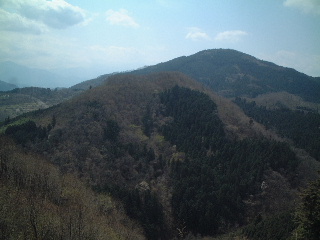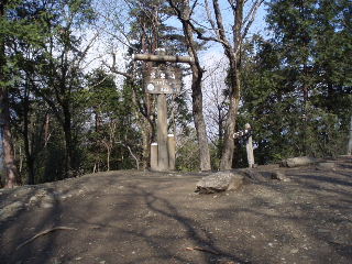 | ここが御嶽山(323m)のようです。この裏側から登ってきました。コチラが正面です。 来た道を戻ろうと思いましたが、地図があり、先に進んでも下りられそうだったので先に進みます。 面白いことに山頂御嶽山を少し下ると九合目が三笠山です(左下)。そこからの宝登山の眺めが良いです(下)。 三笠山といえばドラ焼きを思い出しますが、ここから見える宝登山はまさにドラ焼き、美味しそう!(^^ゞ |