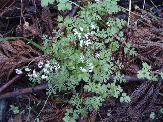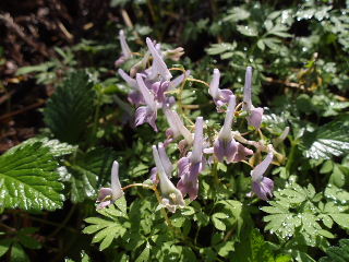| 分岐には分かりやすい標識がしっかりついています。毒キノコの説明もありました。 ここから少しの間林道歩きです。途中にはヤマエンゴサクも。(ジロボウエンゴサクかと思いましたが、分布的にヤマエンゴサクだろうかと思いますが・・) 犬を乗せた軽トラの脇を通り過ぎ・・・・実はこれが後から思わぬ再会?に! |