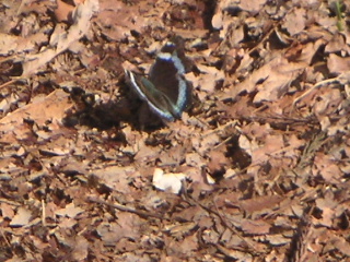 | 蝶々がとまっていました。何と言う名前か分かりませんが、早いですね。蝶ではないのかな? この時ガサッと左側で音がしました。茶色い野うさぎが側まで来ていたそうです。私たちに気付いてすぐ行ってしまいましたが、私は熊の、もといトシちゃんの陰で見ることが出来ませんでした(泣) |